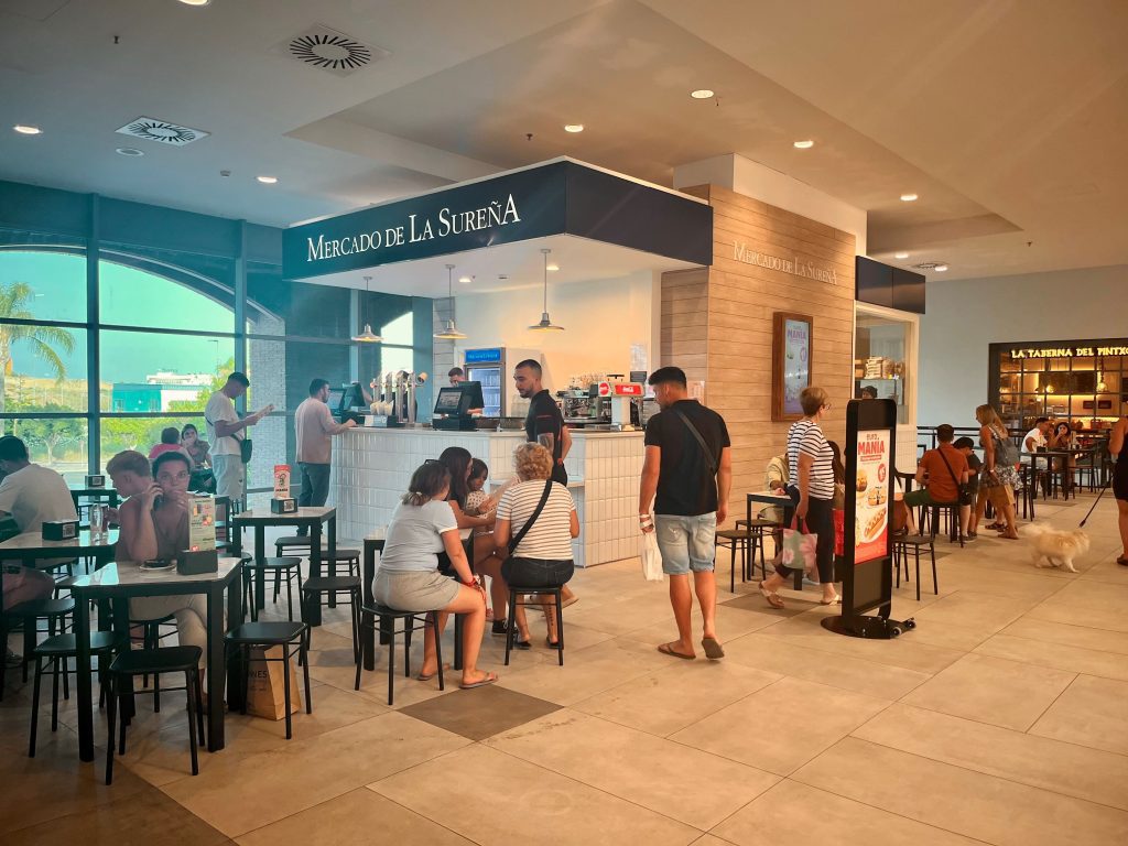 El Mercado de la Sureña, con una superficie de más de 120 m2, compuesta por kiosko y terraza, incorpora una amplia carta: raciones y aperitivos para compartir, montaditos, hamburguesas, perritos calientes, ensaladas… en general, una selección de los productos con más éxito de los establecimientos del Grupo Restalia.